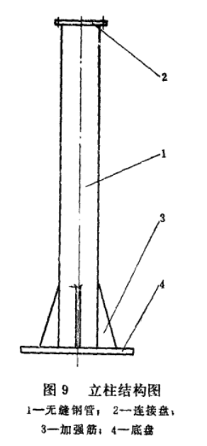 立柱用以支承平衡吊回轉(zhuǎn)部分及額定起吊零件的重量,所以要求有足夠的剛度。立柱的結(jié)構(gòu)一般選用大口徑無縫鋼管與連接盤、加強筋、底盤等零件焊接而成(圖9)。焊后要進行退火處理。立柱的尺寸可參閱表2。