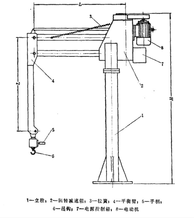 平衡吊主要由立柱1、回轉(zhuǎn)減速箱2、拉簧3、平衡臂4、手柄5、吊鉤6、電源控制箱7及電動機8等零部件組成,如圖所示。其外型尺寸參閱表1。