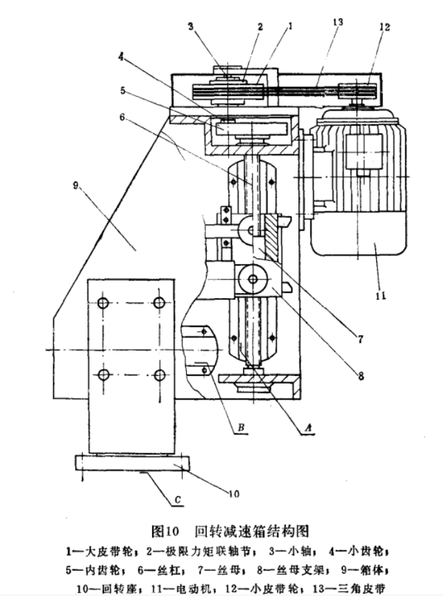 回轉(zhuǎn)減速箱由大皮帶輪1、力矩聯(lián)軸節(jié)2、小軸3、小齒輪4、內(nèi)齒輪5、絲杠6、絲母7、絲母支架8、箱體9以及回轉(zhuǎn)座10等零件組成。回轉(zhuǎn)減速箱與電動機11、電源控制箱及平衡臂相連接,其結(jié)構(gòu)如圖10所示。